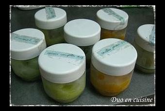 Pour ne pas avoir la tête dans le guidon toute la semaine, on fait des petits pots à l'avance: cocotte-minute (dans le panier vapeur) puis mixeur plongeur, on répartit dans des pots de yaourt, on étiquette et hop, au congélateur! Pour la nounou, c'est plus simple, elle va voir dans le congélateur: le salé en haut, le sucré en bas, et il y en a toujours d'avance!
