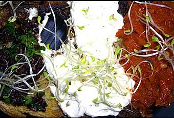 Faire dorer 2 tranches de pain par personne au toaster. Mixer les tomates confites avec un peu de basilic et un peu de leur huile de conservation, réserver la préparation. Mixer environ une quinzaine d'olives noires avec un peu de persil, un peu d'huile d'olive et une gousse d'ail écrasée, ajouter une petite pincée de sel si nécessaire.Tartiner vos tranches de pain dorées en commençant par les tomates confites, puis le fromage frais, puis les olives! Décorez en déposant des graines germées par dessus! C'est prêt!