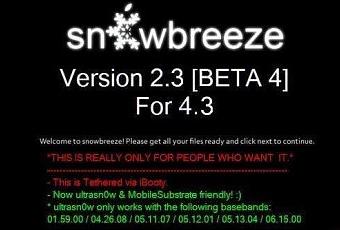 Présenté dans la semaine, disponible depuis cette nuit, Sn0wbreeze 2.3 bêta 4 permet le jailbreak tethered de l’iOS 4.3 et le désimlock avec Ultrasn0w Fixer selon certaines conditions.