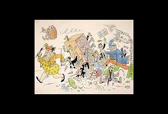 Le caricaturiste Albert Dubout aurait croqué l’époque sans déceler de changement dans le comportement des gens du XXIe siècle. Les entassements de braillards difformes sévissent toujours, la jungle surpeuplée des soldes commerciales qui implique d’écraser l’autre pour remplir au mieux son panier n’a pas varié d’un iota, les couples improbables, mal associés, franchement disgracieux, qui s’étripent sur l’air de l’union singée ont toujours droit de cité… Suivons à la loupe ces foules comme autant d’individualités, mais sans espérer d’individualisation des attitudes : ça gueule uniformément dans une obscénité des trognes.