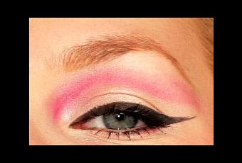 Rien de bien sorcier, on suit le creux de la paupière avec un fard de couleur vive (en l'occurrence, ici, fuchsia) sur une base nude. Un pinceau biseauté fera parfaitement l'affaire, mais vous pouvez, comme moi, utiliser un petit pinceau plat.