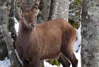 Je choisi de débuter ma ballade au « Pré-aux-Favres », laissant mes raquettes dans le coffre de la voiture au vu du faible enneigement actuel. Si la marche d’approche s’est passée sans surprises, le premier spécimen que l’aperçois au bord du cirque du Creux-du-Van n’est pas un bouquetin mais un… photographe animalier plein de talent, Reto Bolliger. La discussion s’engage rapidement, puis nous nous dirigeons ensemble vers un petit groupe de trois bouquetins qui sortent tranquillement de la forêt du dos d’Ane à la recherche de quelques herbages.