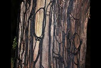 Rhizomorphes d’Armillaria medea sous l’écorce d’un Érable champêtre (Acer campestre) mort