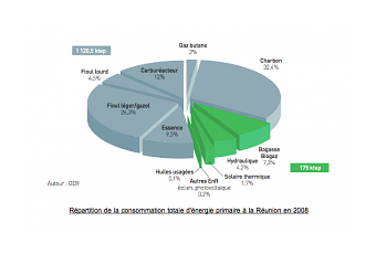 Les chiffres que nous avons pu obtenir datent de 2008. L’énergie primaire totale consommée à la Réunion était de 1295,4 ktep, dont 86,5% (1120,5 ktep) provenait d’énergies fossiles importées (dépendance) et 13,5% (175 ktep) des énergies locales et renouvelables (autonomie). Cela correspond à une hausse de 2,2% de la consommation d’énergie primaire par rapport à 2007.