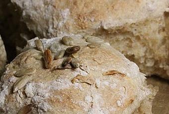 Pour faire des boules de pains , comme la pâte est assez collante , j'ai simplement pris une cuillère à soupe pour les former . A l'aide d'une cuillère soupe bien remplie , formez des boules de pâte , et collez les les unes aux autres sur une plaque de cuisson recouverte de papier sulfurisé . Humidifiez le dessus de la pâte et collez les graines sur le dessus . Quand le four est chaud ,versez un peu d'eau dans le récipient posé dans le four . Cuisez les pains pendant 20 minutes .