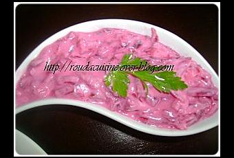 Préparation:Faire cuire les bettraves (bettraves cuites du commerce pour moi) les laisser refroidir puis, les râper. Dans un saladier, mettre le yaourt, l'ail écrasé, le sel et l'huile, remuer le tout. Incorporer les bettraves râpées et mélanger. Servir frais.