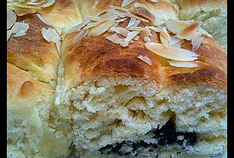 Mettez dans un saladier la farine, le sel et 100 g de sucre. Emiettez la levure dans le lait tiède. Ajoutez 20 g de sucre et mélangez jusqu’à dilution complète de la levure puis ajoutez à la farine. Ajoutez 75g de beurre mou, les oeufs et malaxez. Laissez reposer la pâte dans un endroit chaud pendant 45 minutes. Malaxez à nouveau la pâte puis séparez-la en 12 parts égales. Formez 12 galettes plates. Déposez au centre une cuillerée de pâte de pavot (la recette de la pâte de pavot est ici -clic-) puis fermez en formant une boule. Préchauffez le four therm.6 (180°). Faites fondre 75g de beurre. Déposez les boules côte à côte dans un moule ovale beurré au préalable. Badigeonnez les boules de beurre fondu et couvrez d’amandes. Laissez reposer 10 minutes avant de mettre au four pour 30 à 35 minutes. Servez tiède accompagné de sauce vanille (la recette de la sauce vanille est là -clac-).