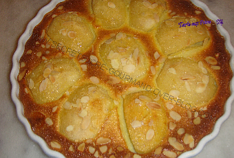 Déposez les poires sur le fond de pâte cuite, verser la préparation sur les poires, ajouter les amandes effilées.