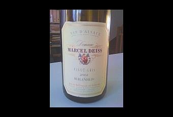 Pinot Gris, Deiss Beblenheim 2002 : Une bouteille qui a très bien évolué en 5 ans, un nez discret mais classe agrume, mandarine, raisin corinthe fond terpénique pétrole léger. La bouche qui présente topujours un poil de gaz évolue sur l'agrume mûr, une matière suave sur une structure droite, de l'allonge, fond de roche silex, un côté tourbé, pointe miel, mandarine, léger pétrole. La finale est ample, ronde, sur le fruit jaune mûr, belle vivacité, note de roche silex et pétrole, sur un fond tourbé assez classe. Très Bien 88Un autre vin espagnol ramené de la caisse retrouvé au fond tout en dessous dans la cave :