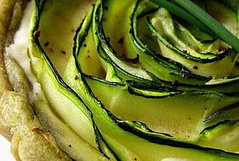 Et pour changer du sucré, j'ai réalisé une tarte salée toute verte. La photo ne rend pas vraiment hommage à la couleur de la pâte, mais elle est vraiment verte. Pour réaliser les fleurs de courgette, il vous faudra impérativement une mandoline pour obtenir des tranches ultra-fines. Si vous n'en aviez pas, vous pouvez aussi juste détailler des lamelles très fines à disposer en rosace. Et si vous n'avez pas de fromage de chèvre, vous pouvez également utiliser de la ricotta. Ce petit fond de fromage vous aidera - en plus de donner du goût et de moelleux à la préparation - à fixer les lamelles de courgettes.