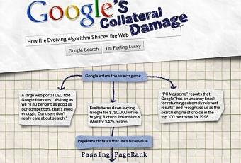 Intéressante, cette infographie détaillant point par point les « dommages collatéraux » réalisés par le fameux algorithme de recherche mis en place par Google. Par exemple, on pourra se rendre compte de l’importance prise par le fameux rel=nofollow, ou du fait qu’à lui seul, cet algorithme aura réussi à pousser les sites à essayer de faire grimper leur page rank à n’importe quel prix, ou presque…