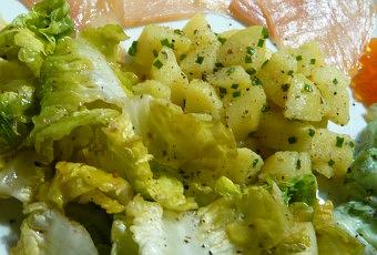 Souvent, quand on veut faire un repas simple, on pense salade : on prend différents ingrédients, on les mélange, on sert. C'est souvent très bon si les parfums des aliments se marient harmonieusement. Mais la salade impose sa règle : tout est mélangé et on n'a pas forcément accès à tel ou tel ingrédient qu'on voudrait goûter de façon isolée. Alors, pour varier et retrouver un peu de "liberté", pensons aussi aux assiettes composées. Cela peut donner une jolie présentation, plus claire, et chacun peut décider de manger les aliments ensemble ou séparément. Ainsi, ce soir-là, il y avait du saumon fumé et des oeufs de saumon, des pommes de terre, du concombre, de la salade. On aurait pu en faire une salade mais c'était appétissant et délicieux comme cela.