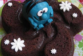 J'ai préparé le moelleux au chocolat de frimousse06, qui est vraiment excellent, je le recommande ! Et pour le décor, j'ai fabriqué un bonhomme en pâte d'amande bleu et quelques petites fleurs en pâte à sucre.