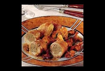 - Déposer 1 cuillerée du mélange sur chaque filet, le rouler sur lui-même et l'entourer de crépine.