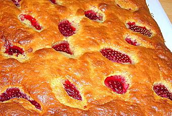 Verser la pâte dans un moule (en silicone, 20 cm x 20 cm pour moi) et répartir les fraises en les enfonçant à peine dans la pâte.