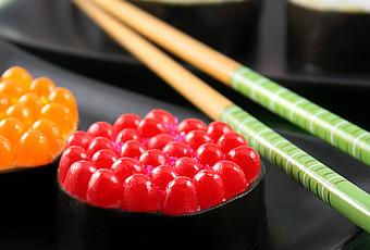 Décorer le centre des sushis de fèves à la gelée et/ou de jujubes tranchés, afin d’imiter les garnitures de vrais sushis (les sashimis pourront être décorés de jujubes orangés tranchés et d’une bande de fondant posée de façon perpendiculaire à la garniture).
