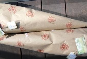 Papier cadeau réalisé à partir de papier d'emballage récupéré, tampon fleur et encre rouge