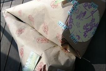 Papier cadeau réalisé à partir de papier d'emballage récupéré, repassé, motif répété d'un tampon fleur à l'encre rouge, scotch décoratif
