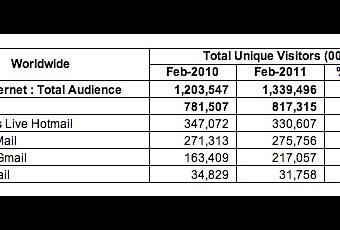 comScore vient de dévoiler des chiffres très intéressants, puisque comparant l’audience entre février 2010 et février 2011 des principaux sites de messagerie. Soit Hotmail, Yahoo! et Gmail. Pour faire simple, si Gmail a réussi en un an à voir son nombre de visiteurs uniques grimper de 33%, il n’en reste pas moins qu’il est encore assez loin des 2 mastodontes que son Yahoo! Mail et Windows Live Hotmail. Même si parallèlement, ce dernier accuse en un an d’une baisse de ses visiteurs uniques de l’ordre de 5%. Loin d’être suffisant pour lui faire perdre sa place de leader…