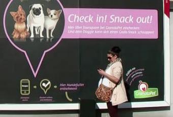 Voici une idée originale qu’a eu la marque de croquettes pour chien GranataPet en Allemagne. Elle a en effet réalisé une pancarte publicitaire dans laquelle est intégré un distributeur automatique de croquettes, qui distribue ces dernières uniquement quand un Check-In du lieu où il se trouve est effectué sur Foursquare ! Fallait y penser non ?