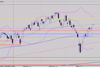 Il le fait, non pas en créant une bougie blanche comme je le pensais hier, mais en formant un doji dont le corps, on le notera, s'est construit sur la résistance oblique (je ne dirai jamais assez que le marché possède une excellente mémoire!) matérialisée depuis quelque temps déjà sur le graphe car construite sur des plus hauts atteints en juin et août 2010. Mais celle-ci n'a pas vocation à bloquer le marché.