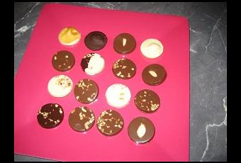 Je mets dans ces petits chocolats plats une amande entière ou des éclats de nougatines mais aussi du caramel au beurre salé. Vous pouvez aussi mettre des noisettes entières ou des fruits confits, des raisins secs… À vous de voir…