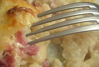 * Disposer le choux fleurs déjà cuit et encore un peu chaud (si possible, il m'arrive de réchauffer un peu au micro-ondes) dans un plat allant au four. Répartir les allumettes de jambon.