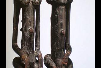 Ainsi que je l'annonçais dans le précédent billet, les sculptures Dogon les plus connues des Occidentaux sont probablement celles dites de style Bombou-Toro du centre de la falaise sud, d'après la désignation établie par Hélène Leloup (in Statuaire Dogon, 1994). Les représentations de couple ont très tôt rencontré un véritable succès auprès des collectionneurs et l'on peut projeter une certaine tendresse dans le geste de l'homme entourant les épaules de la femme.
