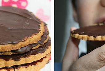 Sortez la pâte, abaissez la à la hauteur de 8mm sur un plan de travail fariné, donnez la forme aux biscuits grâce à 1 emporte pièce. Mettez vos biscuits sur la plaque du four recouverte de papier sulfurisé. Faites cuire 10 à 12 minutes à 170°. Laissez les tiédir, pendant ce temps faites fondre votre chocolat au bain-marie. A l’aide d’une maryse étalez une couche fine de chocolat sur vos sablés. Mettez les au frais une demie heure afin que le chocolat durcisse. Ces gâteaux se gardent quelques jours dans une boite en fer blanc.