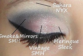 Ce que j'ai utilisé :Primer Potion d'Urban DecayGel liner Silk White de CS en base coloréeMeringue de la Sleek Good Girl (2èm fard de la 1ère rangée) en coin interneVintage de SMH au centre de la paupière mobileSmoke and Mirrors de SMH sur le coin externe, en banane et sur le ras de cil inférieurSahara de NYX en touche lumièreGel liner Midnight in Paris de Essence Je l'aiiiiime ce liner !!Glitter Liner Silver de NYX sur le ras de cil inférieur et sur le bord du trait de linerAqua Eyes de MUFE sur la muqueuseMascara Zoom Art de P2