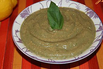 Extrayez avec une cuillère la chair des aubergines et la mettre dans le bol du mixer avec les feuilles de basilic, huile d’olive, l’ail, sel, poivre et enfin le citron.