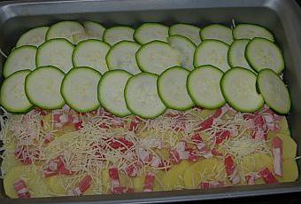 lardons, de nouveau de l'emmental, des courgettes, disposer le reste des lardons, de l'emmental et une couche de pommes de terre.