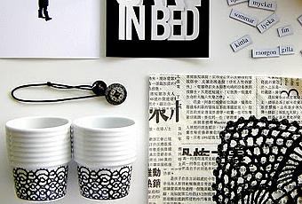 Photo Anna G.Les masking tapes japonais viennent de Merci à Paris, le bloc-note de Svenskt Tenn, les tasses à espresso sont dessinées par Filippa K pour Rörstrand, le bracelet a été acheté à Paris (mais je ne me souviens pas où...), la carte à gauche est de Hilda Grahnat/Help Japan, celle à droite de Therese Sennerholt, le collier vient de Snö of Sweden, le bol d'Iittala, les mots magnétiques aident mes enfants à améliorer leur suédois, la serviette en papier vient de Granat en Suède, et le panier est un cadeau venant de Suède.