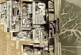 On commence fort avec l’œuvre très originale de Brian Dettmer. Cet artiste américain prend couteau, scalpels et autre objets coupants pour littéralement disséquer des ouvrages et exposer le sens qu’il peut leur trouver. Les images et mots du livres ne sont pas altérés, juste montrés de manière originale…