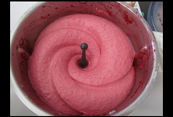 Ajoutez les framboises. Mixez à nouveau. Ajoutez un blanc d’oeuf, pour éviter que la glace ne fasse des « paillettes » par la suite. Mixer tout en décollant la glace des bords du bol à l’aide de la spatule spécifique.
