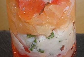 Dans une verrine mettre les dés de tomates qui reste puis le mélange crabe fromage blanc ajouter le pamplemousse et recommencer les tomates et le mélange crabe fromage blanc ciboulette.