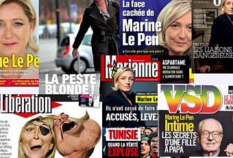 Marine Le Pen est une «bête politique» dixit Rachida Dati, ex-ministre sarkozyste, le 20 janvier dernier au Grand Journal de Canal+. La nouvelle présidente du Front national est (trop ?) souvent à la Une des médias – Image : patchwork de RésistanceS.be.