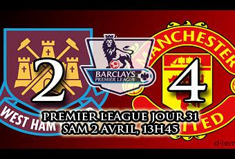 Dès la 3ème minute, Park forçait un corner que se chargeait de botter Ryan Giggs. Celui-ci trouva la tête de Smalling mais Robert Green écartait le ballon d'une jolie claquette. Mais les choses vont vite prendre une tournure inquiétante, sur un très long ballon de contre, Carlton Cole partait dans le dos de Vidic et Evra, ce dernier parvenait tout de même à se replacer devant l'attaquant des Hammers qui avait du mal à contrôler un ballon bondissant, il tenta alors de faire sauter le ballon au-dessus d'un Patrice Evra qui agita les deux mains en l'air façon hold-up... Penalty. Contre-pied parfait de Noble. 1-0.