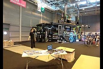 Le train à 7h au départ de Lille, nous voilà Corentin et moi vers 8h45 à la Pte de Versailles, Hall 4 pour nous installer tranquillement pour l'ouverture des porte du salon vers 10h. On fait la connaissance de nos voisins: L'équipe Ravanel and Co avec Thierry à sa tête, et leur énorme camion! On commence à déballer notre matériel, élingues, doubles poulies alu slack.fr, Jumpline, etc... On installe le tout sur les plots de 1Tonne chacun, on met les tapis sous la slack, on tend et on monte sur la slack histoire d'apprécier la tension... A peine un saut effectuer et voilà que les deux plots se rapprochent de 20 cms... Premier problème, les plots sont beaucoup trop légers, deuxième problème, même si ils avaient été assez lourd, ils auraient glissé sur la moquette... au bout de deux heures de recherches de solutions et d'un crochet goutte d'eau cassé, on trouve des poutres de 5m de long que l'on mettra entre les deux plots afin qu'ils ne se rapprochent plus. On se retrouve donc avec à peine 4m de sangle une fois déduit le mouflage des poulies. Pas l'idéal mais on fait avec.