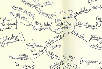 Une bonne occasion de prendre des notes... sous forme de cartes heuristiques ! Matériel utilisé, outre mon cerveau : carnet Moleskine format A6, sans carreaux, et un stylo fin Faber-Castell PITT artist pen, à encre de chine noire. Le tout tient dans une poche de veste. J'ai assisté à cinq débats sur deux jours, produisant une double page par débat (1h30 chacun). Les 5 cartes sont visibles sur facebook