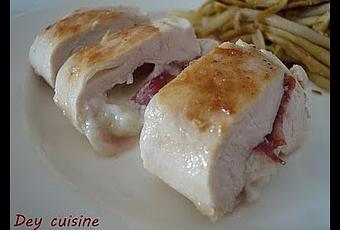 - Pour chaque escalope : déposer une tranche de grison dans la "fente" puis y répartir des tranches de mozzarella, rabattre la tranche de grison qui dépasse sur la mozzarella et refermer l'escalope. Maintenir l'escalope fermer à l'aide d'un cure dent. Saler et poivrer.