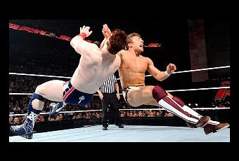 En moins de temps qu’il ne faut pour le dire il est déjà sur le Champion des USA. D’un saut spectaculaire il terrasse le Guerrier Celte sauvant Bryan d’une blessure certaine.