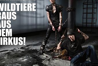Attachés à un poteau par des chaînes, les deux frères jumeaux dénoncent par cette position les conditions de vie des animaux de cirque.