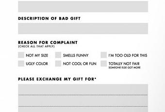 Parce que ça peut toujours servir, voici un formulaire qui va vous permettre d’aiguiller la personne indélicate qui vous aura offert un cadeau dont l’intérêt est proche de 0, vers un nouveau cadeau cette fois collant un peu plus à vos goûts. Clic droit > enregistrer sous > et à coller dans le dossier « prévision anniversaire/noel 2011″. Ne me remerciez pas, vraiment… (vous pouvez par contre vous amuser à le traduire en Français durant la pause de midi, si le coeur vous en dit !)