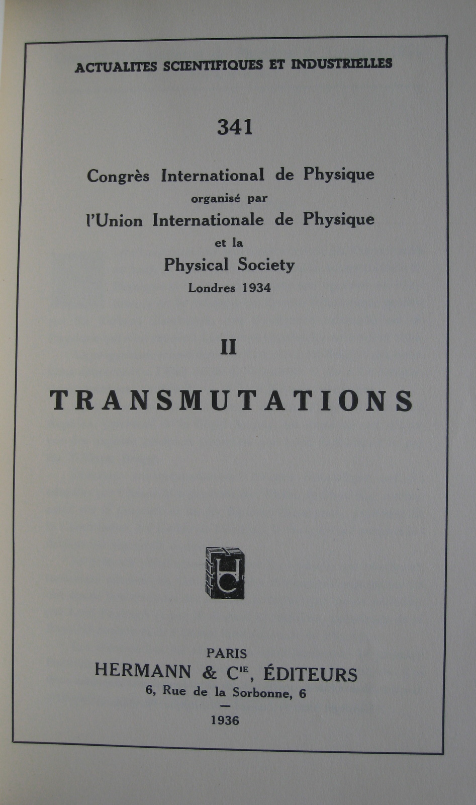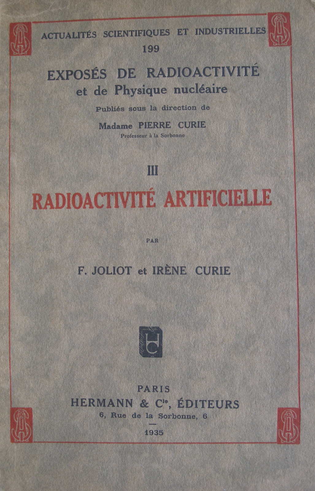 Cette brochure fait partie de la collection des Actualités scientifiques et industrielles n°341. Elle a paru à l’occasion du congrès international de physique organisé par l'Union internationale de physique et la Physical Society à Londres en 1934. Elle contient également des interventions de Rutherford, Born, Fermi, Crokcroft, etc.Frédéric Joliot conclut ainsi son exposé : « … nous sommes en droit de penser que les chercheurs, brisant ou construisant les éléments à volonté, trouveront le moyen de réaliser de véritables transmutations à caractère explosif, une transmutation en entraînant plusieurs autres. Si de telles transmutations arrivent à se propager dans la matière, on peut concevoir l’énorme libération d’énergie utilisable qui aura lieu. Mais hélas, si la contagion a lieu pour tous les éléments de notre planète, nous devons prévoir avec appréhension les conséquences du déclenchement d’un pareil cataclysme… Si un jour un chercheur trouve le procédé, tentera-t-il l’expérience ? Je pense qu’il la réalisera, le chercheur étant curieux et aimant l’aventure».