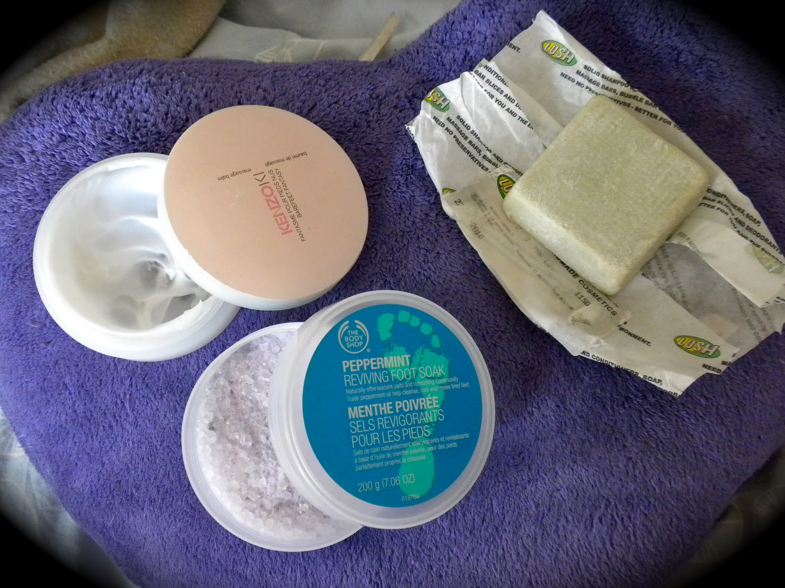 Alors pour cela j'utilise trois produits: 1,2,3 partez de Lush, Les sels revigorants à la menthe poivrée de chez The Body Shop, et Fantasme pour pieds nus de Kenzoki