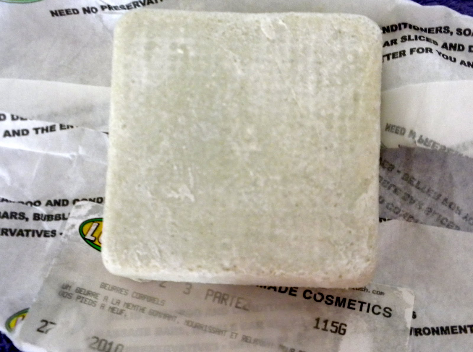 Une fois par semaine j'exfolie avec 1,2,3 partez de Lush qui est un pain des massage à utiliser sous la douche. Il contient du beurre de cacao, du beurre de karité, et de la menthe. Il y a des petits grains de pierre ponce dedans, d'où son effet exfoliant, mais je suis triste car il n'est plus commercialisé.