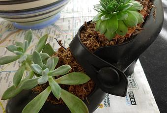 Voilà des plantes vertes qui poussent dans un escarpin.