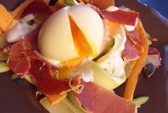 Préparer de fines lamelles de courgette et de carotte afin de réaliser les tagliatelles. Couper de fines lamelles de fromage. Couper le jambon de Bayonne en petits morceaux.