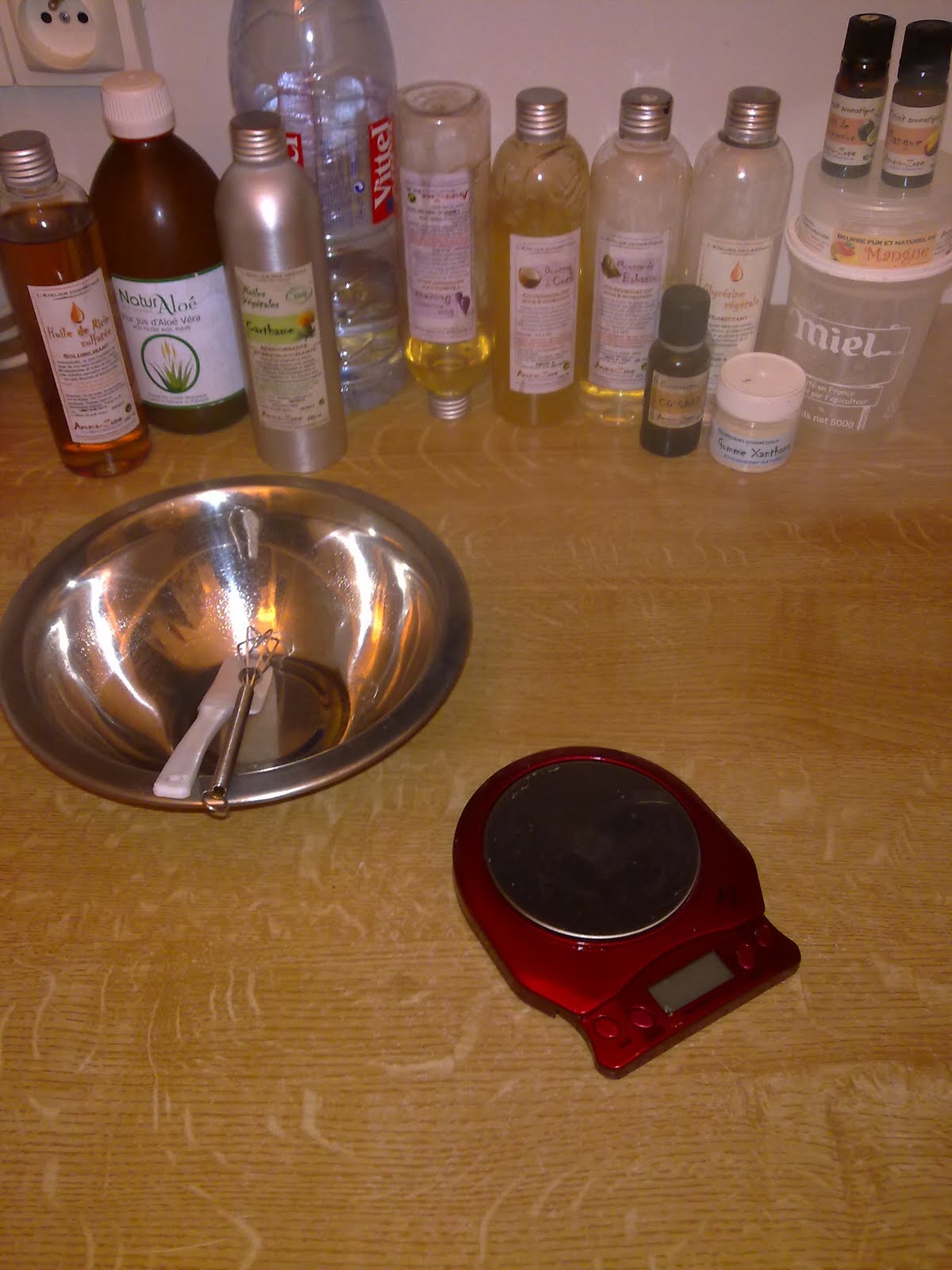 INGRÉDIENTS pour 250 ml :- 20% soit 50 ml d'eau minérale- 20% soit 50 ml de pur jus d'aloe vera à filtrer Natur'aloe (Excellent hydratant, nutritif, cicatrisant cutané, apaisant, stimule la synthèse du collagène et de l'acide hyaluronique, purifiant et protecteur)- 1% soit 2.5g de Gomme Xanthane (épaississant)- 18.5% soit 46,3g de Base Moussante Douceur (tensioactif doux)- 2.3% soit 5.8g de Douceur de Coco (tensioactif doux)- 4.6% soit 11.5g de Mousse de Babassu (tensioactif au fort pouvoir moussant)- 10% soit 25g de Miel Les vergers de Picardie (cicatrisant, hydratant, adoucissant, régénérant, empêche le développement des bactéries, lutte contre les inflammations)- 7% soit 17.5g de Glycérine végétale (hydrate, assouplit et lisse la peau)- 5% soit 12.5g d'Huile végétale de Carthame (lutte contre la couperose et les rougeurs diffuses, restructurant, réparateur, relipidant, nourrissant, émollient, antioxydant, fluide et léger)- 5% soit 12.5g de Beurre de Mangue ( émollient, adoucissant, assouplissant, régénérant, antioxydant, apaisant)- 5% soit 12.5g d'Huile de ricin sulfaté ( émollient, pouvoir nettoyant léger)- 1% soit 2.5 ml d'extraits aromatiques de mangue et de fruits de la passion , à proportions égales ( parfums extras)- 0.6% soit 50 gouttes de conservateur Cosgard- 1 cuillère PINCH d'ocre rose d'Italie ajoutée en fin de préparation (finalement)MODE OPÉRATOIRE :